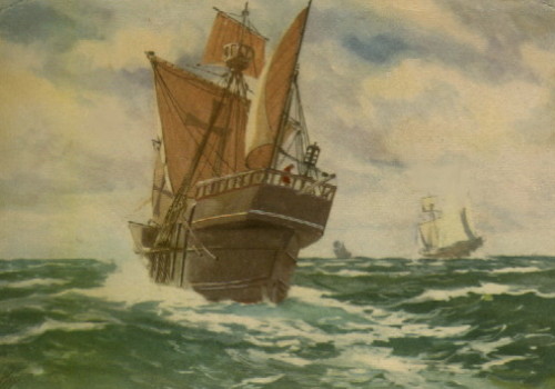 Christoph Kolumbus Um 1447 in Genua geboren, Sohn eines Tuchwebers. Nach mehreren Seereisen faßte er den Plan, das Wunderland Indien auf dem Westwege zu erreichen. Der König von Portugal lehnte seine Vorschläge ab. Kolumbus wandte sich nach Spanien und fand schließlich bei der Königin Isabella Gehör. Ein Vertrag mit der spanischen Krone wurde geschlossen: Kolumbus erhielt den Titel eines Großadmirals und sollte Vizekönig der neuentdeckten Länder werden. Am 3. August 1492 stach er mit 3 Schiffen in See. |