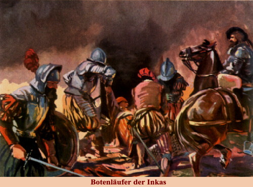 Plündernde Spanier - zerstörte Kulturen Im Gefolge der spanischen Eroberungsarmee kamen auch viele Abenteurer aus Europa in das Land der Inkas. Sie fanden einen Reichtum an Gold und Edelsteinen vor, den sie in ihrer Heimat nie gesehen hatten. Geblendet von diesen Schätzen raubten und plünderten sie alles, was ihnen unter die Hände kam. Die Reste der Inkas zogen sich in die unzugänglichen Bergfestungen zurück. Sie beschworen ihre Götter und warteten auf den Tag der Rache.- Er kam nicht, und heute zeugen nur noch die Ruinen von der einst so großartigen Kultur. |