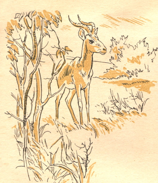 Nachdem wir ihm einige Geschenke überreicht hatten, wurde er zugänglicher und erzählte uns schließlich von der nicht weit entfernten Elefantentränke und dem geheimnisvollen Elefantenfriedhof. Gespannt folgten wir dem Palaver des Häuptlings, aus dem hervorging, daß alte, kranke Elefanten sich durch weite einsame Sumpfgebiete schleppen sollten, um dann im Morast zu versinken. Immer wieder sucht man diese Elefantenfriedhöfe, aber bisher hat sie noch keiner gefunden. Um unsere Fleischbestände aufzufrischen, gingen Böhlau und ich am anderen Morgen in aller Frühe auf Jagd. Hinter einem kleinen Hügel legten wir uns auf die Lauer. Allzulange brauchten wir nicht zu warten, da sichteten wir ein Rudel Antilopen. Äsend kamen sie auf uns zu. Auf das prächtige Leittier deutend, gab mir Böhlau zu verstehen, daß ich schießen sollte. Das Herz schlug mir bis zum Halse, ich hatte Jagdfieber. Ich hob mein Gewehr, ruhig suchte ich mein Ziel, langsam krümmte ich durch, und im Feuer brach der Bock zusammen . |