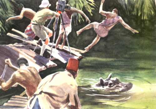 ANTILOPEN, FLUSSPFERDE UND ELEFANTEN Die erste Bekanntschaft mit Nilpferden machten wir in Uganda. Böhlau hatte von Eingeborenen zwei Boote gekauft. Die Träger waren inzwischen umgekehrt, und wir fuhren durch viele Flüsse und Seen. In einer kleinen Bucht sahen wir eine Anzahl Flußpferde vor sich hindösen. Von einigen konnte man nur die massigen Köpfe sehen. Unter Wasser befindliche Tiere verrieten sich nur durch die ständig aufsteigenden Luftblasen. Frank brannte darauf, einige Filmaufnahmen davon zu machen. Böhlau feuerte auf einen dieser Kolosse. Anscheinend hatte er das Tier nur verwundet, denn es schnaubte wild auf, unerwartet ging die ganze Herde zum Angriff über. So schnell wie möglich ruderten wir dem Ufer zu, während die Kamera alle Einzelheiten der Verfolgung filmte. Es wurde brenzlig. Immer näher kamen die Flußpferde, selbst Frank mußte zum Ruder greifen. Nur mit Mühe erreichten wir rechtzeitig das Ufer und erkletterten schnell einige Bäume. Wir schossen, was die Gewehre hergaben. Es gelang uns dadurch, die Tiere zurückzujagen. Wir setzten unsere Bootsreise fort. "In den nächsten Tagen bekommen wir vielleicht schon Elefanten zu sehen", meinte Böhlau. "Nördlich vom Victoria=See soll es noch größere Elefantenherden geben. Leider sind diese Dickhäuter durch rücksichtslose Elfenbeinjäger fast ausgerottet worden." |