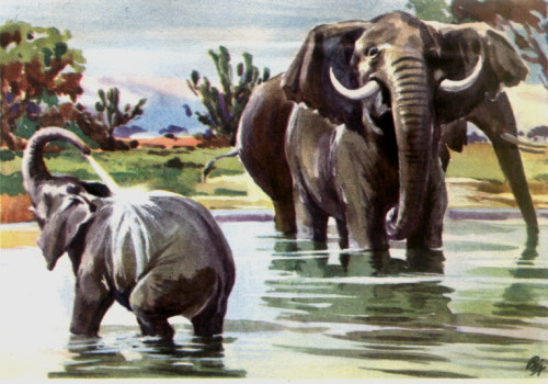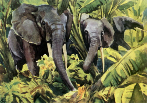 Elefanteneinbruch in eine Bananenpflanzung Elefanten stehen fetzt unter Naturschutz. Sie sind die größten pflanzenfressenden Säugetiere und größten Landtiere überhaupt. Sie leben in Familien, sind schlau, gereizt sehr gefährlich. 100 fahre sollen sie alt werden. Ihr Gewicht wird mit etwa 80 Zentnern angenommen. Im tropischen Afrika bevorzugt der Elefant waldige und hochgrasige Gegenden. Seine Stoßzähne werden über zwei Meter lang. |