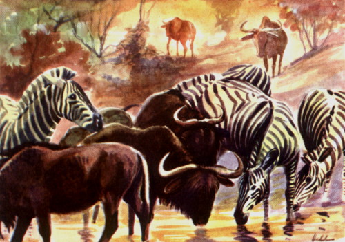 Zebras und Gnus an der Tränke Zebras nennt man auch Tigerpferde. Dieser Name geht auf die ausgezeichnete Schutzfärbung, die die gesamte Körperform in schwarzen Streifen überziehen, zurück. Es gibt etwa 35 verschiedene Arten Zebras. Busch- und Sumpfland wird von diesen Tieren bevorzugt. Sie leben eng mit Gnus und Antilopen zusammen. |