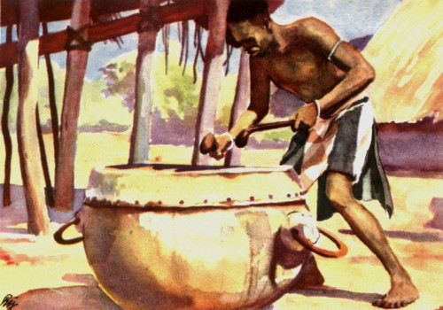 Trommeltelegraf "Bum dada bam bum bam bum - hier spricht der afrikanische Trommeltelegraf mit allen angeschlossenen Trommeln", so könnte es heißen. Das schnelle und zuverlässige Nachrichtenmittel der Eingeborenen ist die große Trommel, die nach besonderen Takten, ähnlich wie beim Morsealphabet, geschlagen wird. Weithin, bis zu 50 Kilometer, hallt ihr dumpfes Dröhnen; es wird von anderen Trommeln aufgenommen, weitergeleitet und gibt somit schnell Nachrichten über weiten Raum. |