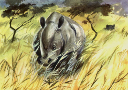 Angriff eines Nashorns Das Nashorn gehört zur Familie der Unpaarhufer. Es ist ein Pflanzenfresser und von überstiergroßem plumpem Aussehen. Auf dem Nasenbein befinden sich ein bis zwei Hörner, die Gebilde der Oberhaut sind und immer wieder erneuert werden. Nashörner findet man in Afrika und Südostasien. Es sind leicht reizbare und angriffslustige, gefährliche Tiere. |