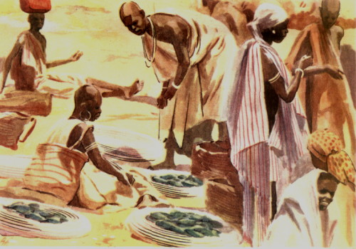 Markt auf einer Plantage in Kenia So ein Markttag ist auch für die Eingeborenen in Kenia immer ein Ereignis. In flachen Körben bieten die Händler ihre Ware an, und vor jedem Kauf wird lange gefeilscht. |