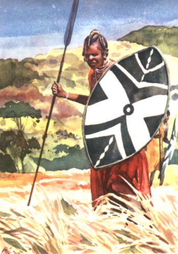 Massai auf Jagd Die Massai wohnen in der nach ihnen benannten Massaisteppe. Sie stammen von den Hamito-Niloten ab. Sie sind von rötlichbrauner Hautfarbe, groß und stattlich. Als Viehzüchter sind sie Nomaden. Ihre Hütten bauen sie aus Strauchwerk, das Gerüst wird mit Grasschicht bedeckt und mit Kuhdung bestrichen oder mit Rinderfellen belegt. Die Hütten sind kreisförmig zu Kralen angeordnet und gegen wilde Tiere und Überfälle mit Dornverhau umgeben. In das Innere dieser Krale wird zur Nacht das Vieh getrieben. Die Männer bekleiden sich mit einem Fellumhang, ihre Frauen schmücken sich mit Metallreifen und Spiralen um Hals, Unter- und Oberarm. Die Krieger sind bewaffnet mit den charakteristischen langen Speeren (besonders lange Spitzen), Schwertern und Keulen. Sie schützen sich mit Schilden, die mit Büffelhaut überzogen sind. |