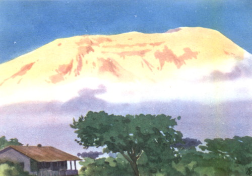 Kilimandscharo mit Pflanzungen Dieser schneebedeckte Berggipfel war für uns ein seltsamer Anblick. Die Eingeborenen nennen ihn den "Berg des bösen Geistes", uns brachte er aber kein Unglück. Wir hatten sogar sehr viel Spaß, denn als wir die Schneehöhe erreicht hatten, fingen wir eine lustige Schneeballschlacht an - und das mitten im heißen Afrika. |