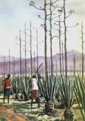 Der hier geerntete Kaffee zählt zu den besten Sorten der Welt. Das Gebiet, das wir auf dem Wege nach Usambara durchquerten, sah kultiviert aus. Es war ein fruchtbares Hochland. Das Klima war angenehm und es regnete auch häufiger. Dabei konnten alle Pflanzen und Früchte üppig gedeihen. Besonders fielen mir die hohen Stauden der Sisalagave auf. Sisal ist eine aus Mexiko eingeführte Pflanze, aus der eine hanfartige Faser gewonnen wird. In größeren Siedlungen entwickeln sich überall. In größeren Siedlungen entwickeln sich überall Industrien, die Sisal zu Garnen, Teppichen und Läufern verarbeiten. Gern sah ich zu, wenn die scharfen Buschmesser in den Händen der muskulösen Schwarzen die harten Blätter der Stauden kappten . |