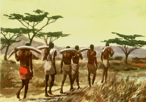 Eingeborene beim Transport von Elfenbein "Weißes Gold" nennt man das Elfenbein auch das hier von den ängstlich davonschleichende Negern an uns vorbeigetragen wurde. Sie fühlten sich bei einer verbotenen Handlung ertappt, denn der Elefant darf in Afrika nicht mehr frei erlegt werden. Woher hatten diese Burschen wohl die großen Eiefantenzähne? Ein einzelner Zahn wiegt bis zu 40 kg. Daher trug jeder Neger auch nur eines dieser kostbaren Stücke. In Deutschland schnitzt man daraus die herrlichsten Kunstgegenstände. Die Stadt Erbach im Odenwald beherbergt eine der schönsten und reichsten Sammlungen geschnitzter Elfenbeinkunstwerke. Heute noch ist hier die Elfenbeinschnitzkunst zu Hause. |