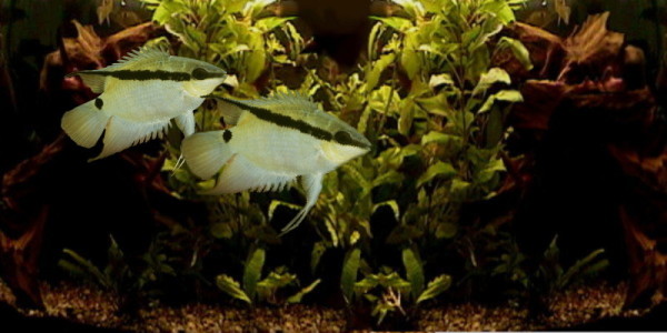 Cichlasoma fesstivum (Flaggenbuntbarsch) Gestalt wie in der Gattungsbeschreibung angegeben. Im gesamten Typ von den übrigen Arten ziemlich stark abweichend. Der Körper verbreitet sich, von dem großen und spitzen Kopf beginnend, nach hinten zu stark. Seitlich kräftig zusammengedrückt, wirkt mit zunehmenden Alter etwas unproportioniert. Die Kehlpartie mit dem kleinen, endständigen Maul sinkt dann immer mehr ein, während die Stirn sich weiter vorschiebt. Rücken- und Afterflosse zugespitzt, beim Männchen ausgezogen, Schwanzflosse fächerförmig abgerundet, Bauchflossen im zweiten Strahl stark verlängert, reichen zurückgelegt bis zur Mitte der Afterflosse. Länge bis 15 cm, Weibchen etwas kleiner. Färbung wie bei allen Cichliden recht veränderlich. Im allgemeinen gelblichgrau bis grün. Ein dunkles Band von der Schnauzenspitze bis zum oberen Ende der Rückenflosse. Die Färbung über dem Band ist meistens dunkler. Auf den Flanken erscheinen zeitweise dunklere Querbänder, die aus lose aneinandergereihten Flecken bestehen. Auf der Schwanzwurzel ein dunkler, hellumrandeter Fleck. Das Männchen ist stattlicher, Flossen spitzer ausgezogen, die blaugrüne Kehlpartie tritt stark hervor. Die Genitalpapille ist bei den Geschlechtern unterschiedlich geformt. |