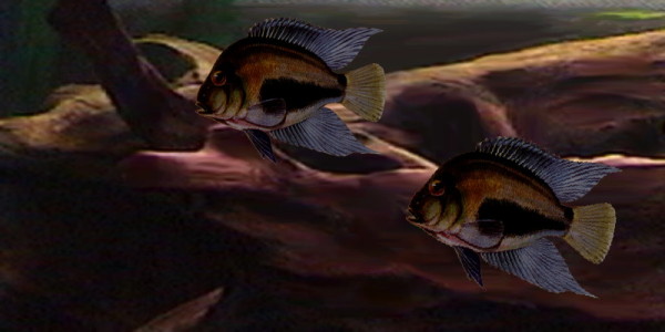 Uaru amphiacanthoides (Keilfleckbuntbarsch) Gestalt: Sehr hoher Körper, der im Alter noch an Höhe zunimmt. Seitlich stark zusammengedrückt. Die Stirn steigt steil an. Länge bis 25 cm. Färbung und Geschlechtsunterschied: In den verschiedenen Altersstufen stark wechselnd. Zunächst ganz schwarz. Im halbwüchsigen Zustand mit vielen dunklen Flecken, ab 10 cm Länge mit breitem, keilförmigen Fleck auf gelblichen Grund. Geschlechtsunterschied gering. Rücken- und Afterflossen beim Männchen etwas zugespitzt. Verbreitung: Amazonasgebiet und Guayana. In dunklen Gewässern mit Holzeinlagerungen, zwischen denen die Fische Versteck finden. Haltung und Zucht: Schwierig zu halten und zu züchten. Die Lebensansprüche ähneln denen von Symphysodon. Gehen wie diese schlecht ans Futter. Benötigt wird ein große Aquarium mit Verstecken aus Steinen und Wurzeln und gedämpftes Licht. Im Allgemeinen ruhig und verträglich, wenn auch ab und zu kleinere Streitereien vorkommen. Temperaturen bei 30 Grad sind günstig. Der Erfolg der Zucht ist von passenden Paaren abhängig. |