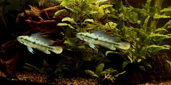 Apistogramma trifasciatum (Gelber-Zwergbuntbarsch) Gestalt: Mäßig gestreckt, seitlich zusammengedrückt.4. und 5. Hartstrahl der Rückenflosse beim Männchen kräftig verlängert. Schwanzflosse abgerundet. Männchen bis 4,5 cm, Weibchen etwas kleiner. Färbung: Männchen blaugrau, Bauch gelblich. Mit einem schwarzen Längsband an den Seiten ähnlich Apistogramma agassizi. Verbreitung: Mit einer ganzen Reihe von Unterarten verteilt über das gesamte mittlere Amazonasgebiet. Eine temperamentvolle Art, die nur geringe Ansprüche bezüglich der Wasserzusammensetzung stellt. |