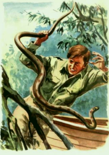 Klaus und die Baumschlange Plötzlich wurde die Luftwurzel, an der sich Klaus festhalten wollte, lebendig. "Leben denn hier die Bäume?" Entsetzt schleuderte er die T/2 Meter lange Baumschlange von sich. Jonny erledigte das giftige Reptil mit dem Buschmesser. |