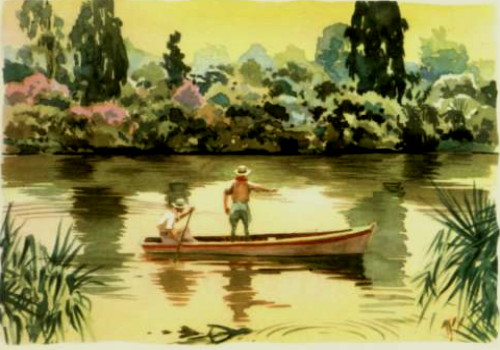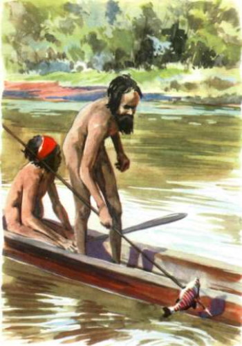 Eingeborener im Einbaum beim Fischfang Als wir um eine Biegung des Flusses fahren, sehen wir plötzlich zwei Boote mit Eingeborenen vor uns. Die Schwarzen stehen in den langen, schmalen Einbäumen mit hoch erhobenen Speeren. Da - jetzt stößt der eine zu! Ein Fisch zappelt an der Spitze des Speeres. |