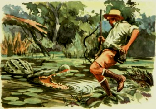 Vorsichtig setze ich einen - Fuß auf den schlammig=glänzenden Stamm. Aber wie elektrisiert zucke ich zurück! Mein "Baumstamm" stößt ein seltsames, gurgelndes Geräusch aus und verschwindet blitzschnell im schlammigen Wasser. Ein Krokodil! Vermutlich habe ich es gerade beim Mittagsschlaf gestört. Mit zitternden Händen stecke ich mir eine Zigarette an. Etwas später sind wir an einem sumpfigen See. Vorsichtig schiebe ich Zweige und Blätter zur Seite. Ein paar Eidechsen verschwinden, leise raschelnd. Etwa 15 Meter vor mir liegen drei "Dicke Männer" träge am Ufer. Wir nehmen uns den mittleren aufs Korn. Ich halte genau auf das blinzelnde Auge des Reptils und - bauz! - fällt der Schuß. Gleich darauf schießt auch Klaus. Wir haben beide getroffen! Das Krokodil schlägt wild mit dem großen, kräftigen Schwanz um sich. Schließlich rollt es auf die Seite und bleibt, mit dem Bauch nach oben, halb im Wasser, halb auf dem Lande liegen. Abends im Eingeborenenlager gibt es Krokodilbraten. Mir schmeckt das Zeug nicht - es riecht nach faulem Wasser. |