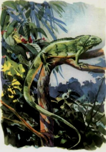 "Ein paar Jahre später brach der Deutsche zu einer neuen Expedition auf. Er wollte Australien in der Ost=West=Richtung durchqueren. Er kam nicht wieder. Auch seine Begleiter blieben verschollen. Irgendwo im Busch sind sie verdurstet. Vielleicht wurden sie auch von Eingeborenen niedergemacht. - Aber man hat Leichhardt und seinen Männern ein gutes Andenken bewahrt. Heute noch heißt das Stromgebiet des Mackenzie=Rivers nach ihm ,Leichhardt=Land'. Na, und auch hier der Fluß, an dem wir entlangreiten, trägt seinen Namen!" Nach einer Mittagsrast holt Klaus die Pferde heran, die in der Nähe weiden. Auf einmal läßt er sie laufen und kommt in großen Sprüngen angeflitzt. "Komm Jim - schnell!" brüllt er schon von weitem. "Ich habe einen Drachen gesehen, der auf zwei Beinen laufen kann!" Nach einigem Suchen entdecken wir den "Drachen" in einem dichten Akaziengebüsch. Es ist eine Halskrausenechse - ein ziemlich großer Bursche/vielleicht 80 Zentimeter lang! Das schuppengepanzerte Tier versucht, tiefer ins Buschwerk zu kriechen. Aber als wir mit einem Stock nachstoßen, wendet sich der "Drachen" plötzlich um, richtet sich auf seinen Hinterbeinen auf und faucht uns wütend zischend an. |
