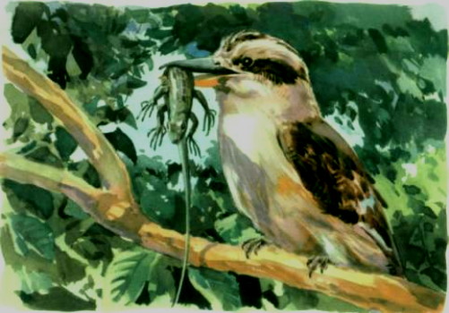 Kookaburra mit Eidechse im Schnabel Die Vogelwelt Australiens ist sehr vielgestaltig. Viele Arten kommen nur hier vor. Einer der bekanntesten Vertreter ist der Kookaburra, den die Ansiedler den "Laughing lade" nennen. Weil er sich schnell an den Menschen gewöhnt, wird er in vielen Familien als der "Kanarienvogel Australiens" gehalten. |
