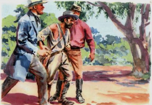 Die Farmer nennen den Kookaburra den "Lachenden Jack", und er gibt tatsächlich Laute von sich, die sich anhören, als lache ein Mensch, der sich hinter einem Busch versteckt hat. Er ist ein mutiger kleiner Kerl, der ohne Bedenken Giftschlangen und Eidechsen angreift, und wenn sie auch doppelt und dreifach so lang sind wie er! Beim flackernden Schein des Lagerfeuers erzähle ich Klaus von Leichhardt, dem deutschen Forscher, der vor 100 Jahren dieses Land durchquerte - Queensland, ein Gebiet, das so groß ist, wie Deutschland, Frankreich, Spanien und Italien zusammen! Mit zehn Begleitern brach er 1843 auf, um einen Landweg von Sydney nach dem Carpentaria=Golf zu finden. Nach anderthalb Jahren tauchte er - halb verhungert und schwer krank - allein an der Nordküste auf. Seine Begleiter waren umgekommen oder hatten ihn verlassen. Er vollbrachte eine Leistung, die einmalig war und die Tausenden von Farmern ein gewaltiges Siedlungsgebiet im Norden erschloß! "Er reiste wie wir, mit Pferden und einer einfachen Ausrüstung. Der Kompaß war das wichtigste und fast einzige Instrument, das er mitführte. Er wurde von Eingeborenen angegriffen und entkam dem Tode um Haaresbreite. Andere Australneger gaben ihm zu trinken, als er nahe dem Verdursten war!" "Was ist aus Leichhardt geworden?", fragt Klaus und setzt den Billy - so nennen wir in Australien den Kochtopf - aufs Feuer. |