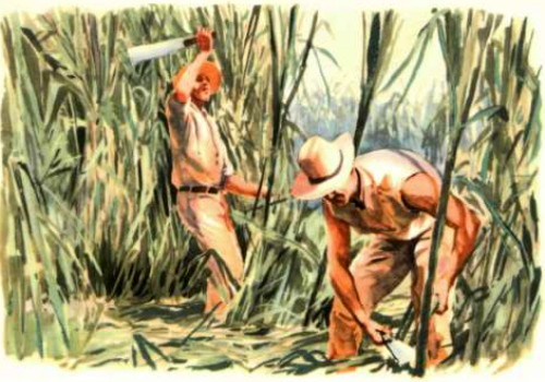 Zuckerrohrernte Vom Zuge aus sahen wir Zuckerrohrpflanzungen. Mit scharfen Messern muß das dicke Rohr abgeschlagen werden - eine mörderische Arbeit in der tropischen Hitze. Australien wehrt sich gegen die Einwanderung farbiger Arbeitskräfte, darum verrichten hier weiße Arbeiter diese schwere Arbeit, die in anderen Ländern nur von Farbigen geleistet wird. |