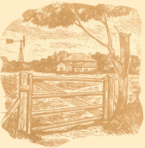 Das ist so schön, daß man es nicht beschreiben kann. Ich möchte jedenfalls an keiner anderen Stelle leben. Wenn es nur manchmal nicht so verflixt heiß wäre! Die Hitze kann uns manchmal schon zu schaffen machen! Dann flimmert die Luft wie ein lter Film im Kino, und die Augen brennen vom Staub und Schweiß. Das Gras wird gelb und braun, und die Flüsse trocknen aus. Ja - das ist hier in Australien anders als bei euch in Deutschland! Im Sommer kann man hier durch die meisten Flüsse hindurchgehen, ohne nasse Füße zu bekommen. Nein - ich schneide nicht auf! Fast alle Flüsse in Australien führen nur in der Regenzeit Wasser, dann aber häufig so viel, daß sie zu reißenden, gefährlichen Strömen werden. Nicht selten sind dann die Ufer weithin überschwemmt. In der übrigen Zeit des Jahres ist das Flußbett ausgetrocknet. Nur hier und da findet sich ein verschlammtes Wasserloch. Das Wichtigste hätte ich bald vergessen: die Station nannte mein Urgroßvater Green Gate, wegen des grünen Gatters, das den Weg zur Viehtränke verschloß. Green Gate heißt unsere Farm auch heute noch. Natürlich ist das Tor inzwischen ein paarmal neu gemacht worden. Mancher Stier hat schon versucht, die Querbalken auf seine Hörner zu nehmen. Und erst in der vergangenen Woche hat mein Bruder Steve - der ein netter Kerl, aber ein schlechter Autofahrer ist - beim Rückwärtsfahren mit dem Lastwagen den rechten Pfosten umgerissen. Aber die Hauptsache: das Tor steht noch wie vor100 Jahren, und grün ist es auch! |