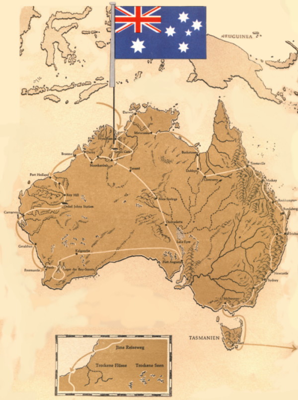 Ich heiße Jim Bradley und bin 16 Jahre alt. Dieses hier ist mein Tagebuch. Als ich noch zur Schule ging, bekam ich immer eine 4 im Aufsatzschreiben. Da ordnete mein Vater eines Tages an, ich solle einmal wöchentlich aufschreiben, was ich so erlebte. Na - und daraus ist dann so nach und nach ein richtiges Tagebuch geworden. Mir machte die Sache Spaß und die Aufsatzzensuren wurden besser. Unsere Farm liegt in Kimberley, im Nordwesten Australiens, gut 150 Meilen von der Küste entfernt. Als mein Urgroßvater vor rund 100 Jahren nach Australien einwanderte, um Gold zu suchen, fand er zwar nur wenig Gold, aber viel, viel Land! Und deshalb begann er schließlich Rinder zu züchten. Er baute seine Station - so nennen wir hier die Farmen, die Vieh züchten - mitten hinein in das Land zwischen Panton, Ord und Margaret, weil es zwischen diesen Flüssen Weide und Wasser für das Vieh gab und vielleicht auch, weil ihm die weite Savanne so gut gefiel. Ich kann das gut verstehen, denn es ist wirklich ein wunderbares Land hier! Besonders im Frühjahr, wenn der Monsun den ersten Regen bringt! Das Gras schießt hoch, und leuchtend bunte Blumen ringeln sich mit ihren Stengeln und Trieben um das wuchernde Akaziengestrüpp. |