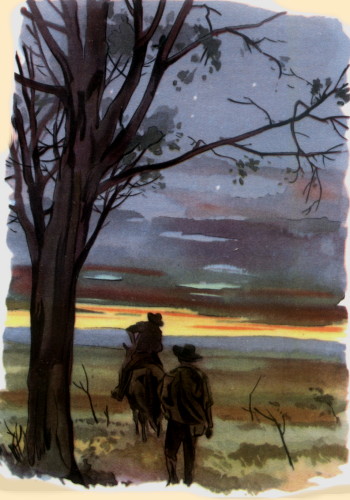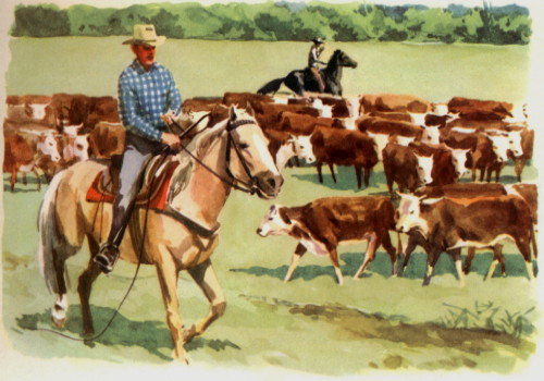 Da - Schritte! Es knackt im Unterholz. Aus dem Dunkel kommen zwei Männer auf das Feuer zu. Es sind die beiden eingeborenen Treiber, die jetzt vier Stunden Ruhe haben. Nun beginnt unsere Nachtwache. Betty, meine Stute, wiehert leise, als ich ihr den Sattel auflege. Auch Bill reitet los. Wir umkreisen die Herde in entgegengesetzter Richtung, so daß wir uns alle halbe Stunde begegnen. Ich höre Bill schon immer einige Minuten früher, denn er singt wie ich beim Reiten. Das tun wir nicht, weil wir Angst haben, sondern weil es die Rinder beruhigt, wenn sie die Stimmen der Menschen hören. Bill kann man am Gesang sofort erkennen, denn er singt immer nur zwei Lieder abwechselnd, die mal vor 30 Jahren modern waren. Das eine ist furchtbar traurig und handelt von einem Buschräuber, der ein blondes Mädchen liebt, und das andere ist ein verrücktes Cowboylied, bei dem Bill sogar zu jodeln anfängt. Anscheinend singt er jetzt gerade das traurige, denn sonst würde ich ihn schon hören. Bill ist ein feiner Kerl. Er reitet wie der Teufel, und wenn er mit der Peitsche zuschlägt, dann liegt der Stier todsicher. Ach so, das muß ich euch erklären. |
