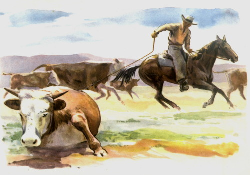 Bill bringt mit der Peitsche einen Stier zu Fall Da bricht - während wir die Herde durch die weite Savanne treiben - plötzlich ein Stier aus! In halsbrecherischem Tempo gt Bill hinter ihm her und schlägt ihm blitzschnell den langen, schmalen Lederriemen der Peitsche um die Beine. Ein kräftiger Ruck - und das Tier liegt am Boden! Aber das muß man können - und Bill kann es! |