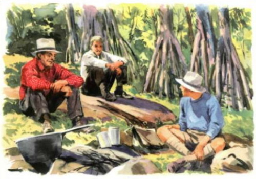 Eingeborenenlager Spät am Nachmittag sehen wir plötzlich in der Sandwüste vor uns das Lager der Eingeborenen. Unter einer Eukalyptusbaumgruppe an einem Wasserloch haben sie ihr Lager aufgeschlagen. Hinter den Windschirmen aus Zweigen und Baumrinden sitzen die Ältesten der Horde. Neben dem Feuer liegen einige Schlangen und eine Beutelratte. Hoffentlich laden uns die Eingeborenen nicht zum Essen ein! |