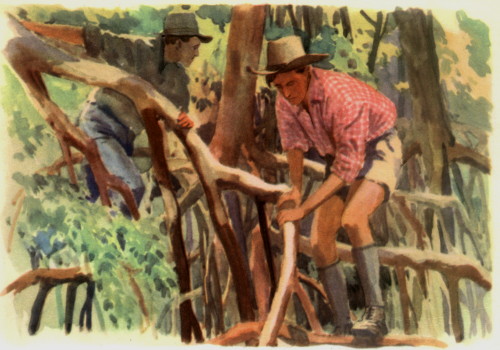 Lagerplatz unter einer Pandanusbaumgruppe Sorgfältig suchen wir die Umgebung des Lagers ab. Drei ausgewachsene Schwarzschlangen, die sehr giftig sind, können wir erlegen. Ein paar andere huschen in das Akaziengestrüpp. Schließlich ist der Hügel unter den Bäumen abgesucht. Das Lagerfeuer brennt, und das Teewasser beginnt zu summen. Der Feuerschein geistert über die hellen Wurzeln des Pandanus, des Schraubenbaumes. Diese seltsamen Bäume mit den langen |