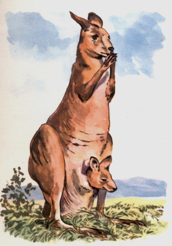 Känguruhmutter Die Känguruhs sind Springbeutler, kaninchen= bis mannsgroß, mit langen Hinterbeinen und kräftigem Stützschwanz. Es gibt verschiedene Arten, zum Beispiel Felsen', Baum', Riesenkänguruhs. Die Felle der kleineren Tiere sind sehr begehrt (Wallaby=Felle). Jährlich werden etwa 200 ooo Stück in den Handel gebracht. |
