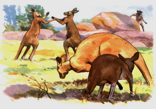 Da ist zuerst einmal der Dingo, der Wildhund, der die Känguruhs verfolgt - wenn er auch einen ziemlichen Respekt vor den Krallen der älteren, großen Tiere hat. Und da sind vor allem die Menschen, die Eingeborenen und die Weißen. Die Eingeborenen jagen Känguruhs, weil sie Nahrung brauchen, die Weißen, weil die Tiere das Gras für die Schafe wegfressen und hier und da auch den mühsam angebauten Weizen. Und nicht zuletzt, weil das Fell des Känguruhs Geld bringt. Besonders das Fell des blauen Känguruhs ist sehr begehrt. Früher, als die Känguruhs auf den Weizenfeldern tatsächlich großen Schaden anrichteten, zahlte der Staat Abschußprämien. Es gab damals viele Leute, die die Känguruhjagd zu ihrem Beruf gemacht hatten. |