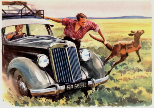 Känguruhjagd mit dem Auto Ein aufregender "Sport"! Es kommt darauf an, das Tier während eines Sprungs am Schwanz zu packen und in den Wagen zu zerren. Boshafte Leute behaupten, daß bei diesen Jagden bisher mehr Autos kaputtgefahren, als Känguruhs gefangen wurden. |