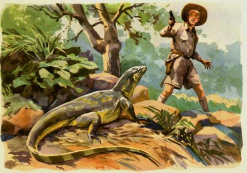 Jim und der Waran Mein Pferd scheut. Es bleibt stehen und schnaubt unruhig. Wir hören ein scharfes Zischen. Vorsichtig gehe ich mit entsicherter Pistole auf den Geröllhaufen zu. Da - ein Waran, eine streckt mir wütend fauchend seinen Kopf entgegen!Rieseneidechse, |
