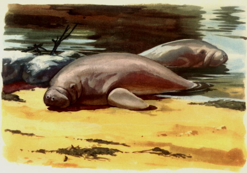 Seekühe "Ein Haifisch", rief ich aufgeregt, als neben uns plötzlich ein länglicher Kopf auftauchte. Aber der Malaie lachte: "Nix Haifisch! Das sein Seekuh." Träge schaukelnd spielten sie neben unserem Boot. Die schwerfälligen Tiere sind selten geworden; denn sie können sich kaum gegen ihre Feinde, die Menschen und Haie, wehren. |