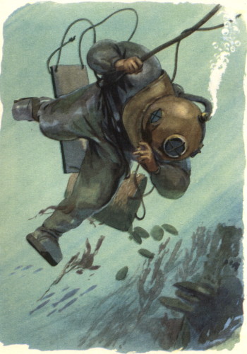 Das Wasser bewegt sich unruhig - es sieht aus, als koche es tief unten. Milliarden kleine Luftbläschen werden an die Oberfläche gestrudelt. Im grünen Wasser unter uns können wir jetzt schon die Umrisse des Tauchers erkennen. Seltsam - er schwankt heftig hin und her, dreht sich linksherum, rechtsherum! Fieberhaft öffnen wir den Helm, als wir den Japaner endlich an Bord haben. Der Mann ist ohnmächtig. Er blutet aus Mund und Nase. "Zu schnell hochgezogen", sagt der Malaie, "dann Mann bluten. Unten Wasserdruck groß, oben klein. Wenn schnell hochkommen, platzen Adern. Wir Taucher immer ganz langsam steigen lassen. Nur wenn Gefahr - dann schnell!" Nach einer kleinen Weile schlägt der Japaner die Augen auf. |