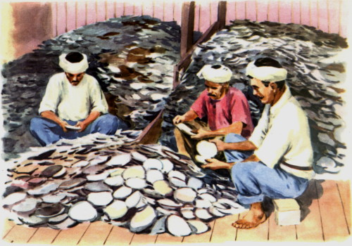 Malaien beim Sortieren von Muschelschalen Die inneren Schichten der Perlmuscheln nennt man Perlmutt, Es besteht aus vielen, flach aufeinanderliegenden Kalkblättchen, die das Licht brechen und dadurch dem Perlmutt den bunten Schimmer geben. Bei der Verarbeitung wird die Muschel zersägt und die äußere Schale abgespalten. Das Perlmutt wird für Schmuck, Knöpfe und Einlegearbeiten verwandt. |