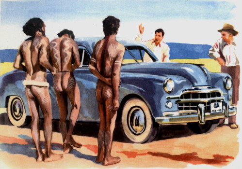 Eingeborene am Auto Heute leben noch rund 60 000 Eingeborene in Australien, größtenteils in Schutzgebieten. Sie bilden die australische Rasse. Im Nordwesten sind malayische, im Nordosten melanesische Einflüsse erkennbar. |