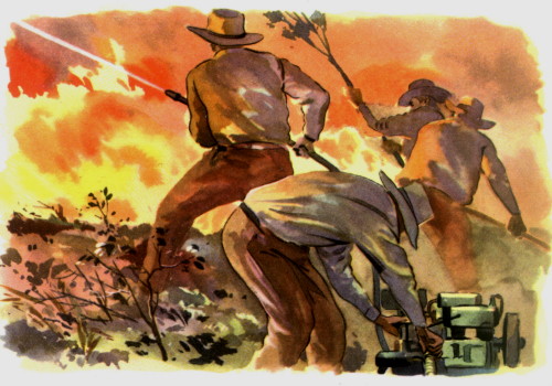 Im Kampf gegen das Buschfeuer In mörderischem Ritt jagen wir den Rauchschwaden entgegen. Und da sehen wir auch schon die Feuerwand vor uns! Schafe kommen uns entgegengerannt, ängstlich blökend und sich gegenseitig stoßend. - Die Männer kämpfen verzweifelt gegen die Glut - Meter für Meter dringen sie gegen das Feuer vor. Augenbrauen und Wimpern sind versengt, und ihre Hemden haben große Brandlöcher. |