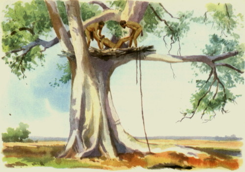 Baumgrab eines Eingeborenen Die Bestattungsbräuche sind bei den Ureinwohnern Australiens sehr verschieden. Häufig werden die Toten in Hockerstellung begraben. Im Nordwesten, wo der Boden felsig oder von der Sonne steinhart gebrannt ist, legt man die Toten in Höhlen oder auf Gerüste, die in Baumkronen errichtet werden. Die Knochen sammelt man später und begräbt sie. |