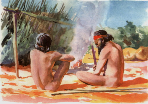 Beim flackernden Feuerschein sehen sie aus wie tanzende Gerippe! Als wir spät in der Nacht zur Ruhe gehen, träume ich noch lange von den wilden, weißen Gesichtern, den blutigen Federn und dem Gehämmer der Bumerangs. Am nächsten Tag geht die Korrobori weiter. Aber heute ist anscheinend etwas ganz Besonderes los! Abseits vom Lager, in einer flachen Sandmulde, wird aus dicken Ästen ein mächtiges Feuer entzündet. Als es lichterloh brennt, decken einige alte Männer ein paar frische, belaubte Zweige darüber. Ein dicker, blauschwarzer Rauch steigt auf. Und dann - Klaus faßt mich erschreckt an die Schulter! - springen vier, fünf Jungen in die Glut, wälzen sich zwischen den aufzüngelnden Flammen und dem beißenden Rauch - mit schmerzverzerrten Gesichtern! "Sind die verrückt geworden?" stößt Klaus zwischen den Zähnen hervor. Auch ich habe eine Gänsehaut bekommen. Vater hat mir früher schon in Green Gate von der Feuerprobe erzählt. Bevor die Eingeborenenjünglinge in die Gruppe der Männer aufgenommen werden, müssen sie eine Reihe von Prüfungen durchmachen. Und die Feuerprobe ist die letzte und schwerste! |