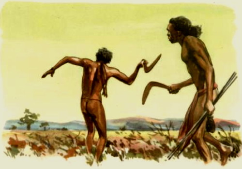 Eingeborene auf der Jagd mit dem Bumerang Für den Europäer sind Australneger und Bumerang unzertrennbare Begriffe. Weniger bekannt ist, daß auch die Inder und die Mokiindianer Arizonas dieses Schleuderholz, das zum Werfenden zurückkehrt, kannten. |