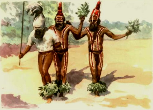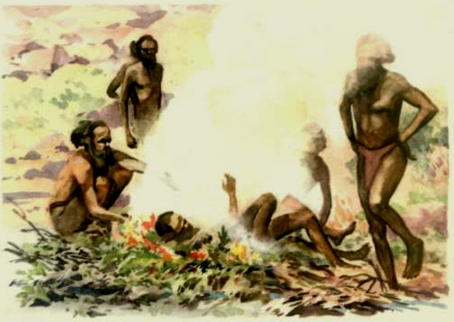 Feuerprobe für die Eingeborenenjünglinge Bevor die Jünglinge in die Gruppe der Männer aufgenommen werden, müssen sie eine Reihe von Mutproben ablegen. Die Feuerprobe - von der verschiedene Formen bekannt sind - ist eine der letzten. |