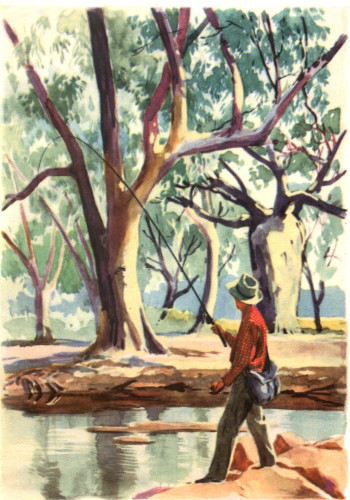 Das Viehtreiben ist ein schweres Stück Arbeit; aber es macht auch Spaß. Gegen Ende des Sommers, wenn die Regenzeit aufhört - Sommer ist in Australien von November bis April, wenn ihr in Deutschland eure Wintermäntel tragt und die Stuben heizt -, beginnt das große Treiben. 500 bis 1000 Rinder werden meistens von vier Cowboys begleitet, und wenn man so einen ganzen Tag im Sattel gesessen hat, spürt man abends, was man getan hat. Vorn geht ein Leitstier, und dann folgt die Herde meist weit auseinandergezogen. Wir umkreisen fortwährend die ganze Meute und passen auf, daß keine Tiere zurückbleiben oder sich seitlich verlieren. Es darf nicht zu langsam gehen, sonst dauert der Transport zu lange, aber auch nicht zu schnell, denn sonst magern die Tiere ab - und ein Rind wird nun einmal nach Gewicht bezahlt. 6 oder 7 Meilen, das sind rund 10 Kilometer, kommt man am Tag vorwärts. Das ist nun keine schnurgerade Straße quer durch die Savanne! Das sind überhaupt keine Straßen, sondern zum Teil sandige, zum Teil von Gras und Buschwerk überwucherte Driften, die von Hunderttausenden von Rinderhufen im Laufe der Jahre getrampelt wurden. Diese Wege winden sich von Wasserloch zu Wasserloch, denn Wasser und Weide sind das Wichtigste beim Treiben. Meistens erreichen wir abends eine Tränke. Oft aber muß das Vieh bis zum nächsten Abend auf Wasser warten, weil das eine oder andere Wasserloch eingetrocknet ist. Abends sind wir immer froh, daß wir den Tag hinter uns gebracht haben. Das Lagerfeuer knistert, das Wasser für den Tee summt, und der Rauch unserer Pfeifen steigt zu den Baumkronen empor, in denen die Kakadus kreischen. Die Rinder weiden ringsherum. Wenn ich mich auf den Rücken lege und zu den Sternen aufschaue, höre ich sie, wie sie das Gras abrupfen und sich ab und zu an einer Akazie scheuern. Aber noch ein Geräusch ist da - das ist Bills Pfeife. Sie gurgelt und pfeift wie eine verstopfte Pumpe. |