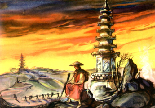 Pagode im blutroten Abendhimmel Überall ragen Pagoden in den glutroten Abendhimmel. Diese Türme, oft 13 Stockwerke hoch, wurden als Wahrzeichen der Tempel zur Ehre Buddhas errichtet. In vielen Pagoden kann man auf Wendeltreppen bis zur Spitze emporsteigen. Andere Türme sind massiv gebaut und tragen die einzelnen Stockwerke nur als äußere Verzierung. An den Bergpässen findet man die Pagoden ohne Tempelhallen; sie mahnen den Wanderer zum Ausruhen, wenn im frischen Abendwind die Glöckschen an den Dachecken erklingen. |