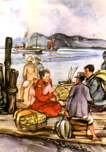 Chinesische Reisende auf einem Anleger Auf dem Anleger am Ostfluß hocken bereits ein Dutzend Landleute, die ihre Erzeugnisse in Bambuskörben auf den nächsten Markt bringen wollen. Von Tom, dem einzigen Weißen hier, nehmen sie kaum Notiz. "Das Dampfboot wird schon voller Menschen sein", sagt Wang. "Sobald es anlegt, müssen wir hinaufspringen, sonst kriegen wir keinen Platz!" |