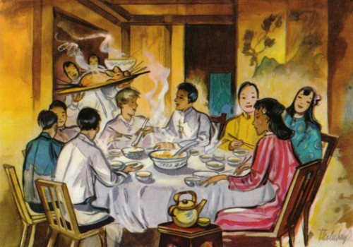 Wangs Tante ist eine freundliche Frau, die gut Englisch spricht. Sie hat drei Söhne und zwei Töchter. So sitzen sie bei jeder Mahlzeit zu neun um den großen runden Tisch im Speisezimmer. Dabei geht es lustiger zu als im Tufeihaus. Zum Abendessen, zwei Stunden nach ihrer Ankunft, hat der Koch bereits 40 Gerichte auf dem Tisch. Haifischflossensuppe, Vogelnestersuppe, Lotoskernsuppe, Hummern, Mandarinfisch, geröstetes Huhn, geröstete Ente, geröstete Tauben, Schinken aus Sojabohnenmehl, Ananas, kandierte Datteln, getrocknete Leitschies und daneben all die andern Gerichte, die Tom schon kennt. |