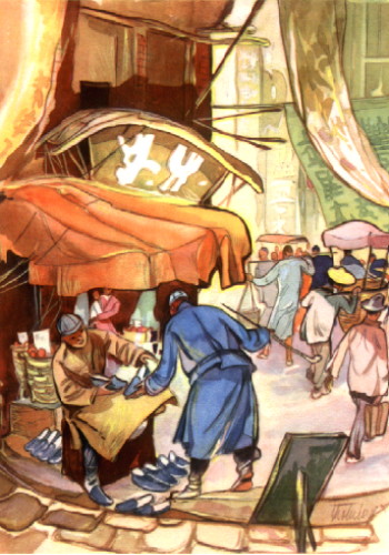 Straße im alten Kanton Seit 20 Jahren gibt es in Kanton kaum noch eine Straße, die den engen Gassen des alten Kanton ähnlich sieht. Die modernen Straßen sind breit und können von Fahrzeugen aller Art befahren werden. In den alten Gassen gab es nur Fußgänger, Sänften und Lastenträger. Die Sänftenträger mußten sich mit lautem Geschrei einen Weg bahnen, die Handwerker arbeiteten vor ihren Türen und zahllose Sonnenschutzdächer hielten alle Sonnenstrahlen fern. |