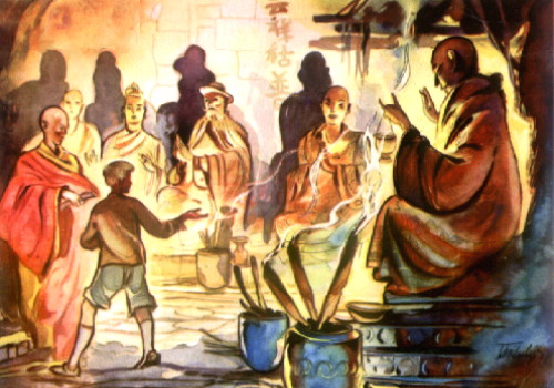 Tom vor dem Bildnis des Marco Polo Unter den 500 überlebensgroßen vergoldeten Nachbildungen buddhistischer Heiliger im Walam-Tempel zu Kanton hat Tom die Statue Marco Polos bald gefunden. Tom fühlt sich irgendwie verwandt mit diesen ersten Weltreisenden aus Venedig, der schon vor rund 700 Jahren nach China kam. Marco Polo ist mit runden Augen und einem Bart dargestellt, während all die anderen Bildnisse Schlitzaugen und bartlose Gesichter haben. Von den Opfergefäßen zu den Füßen der Heiligen steigt süßlich duftender Weihrauch auf. Dumpf dröhnen die Gongs der großen Tempelhalle. |