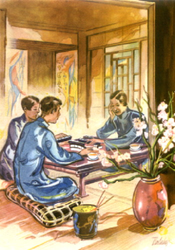 Tom hat sein Bild sicher auf chinesischen Briefmarken gesehen. Dr. Sun ist 1925 - leider ohne seine Pläne verwirklicht zu haben - gestorben. Ihm zu Ehren haben wir in Kanton die Sun=Yatsen=Gedächtnishalle gebaut, in der zehntausend Menschen Platz finden. Montag morgen müßt ihr dahin gehen. Jeden Montagmorgen ist eine Gedächtnisfeier, bei der Dr. Suns Vermächtnis an das chinesische Volk verlesen wird: China, sei einig! China, sei stark! China, modernisiere dich! Nach dem Essen spielt die Familie Mah=Jongg, ein Kartenspiel mit 132 Karten. Aber die "Karten" braucht man nicht in der Hand zu halten, man stellt sie vor sich auf den Tisch. Sie haben die Größe von Dominosteinen und bestehen aus Elfenbein. Am schönsten findet Tom das Mischen der Steine. Dabei werden sie mitten auf dem Tisch von 8 Händen durcheinander gemischt. Das gibt ein lustiges Geklapper. Als Tom ein heißes Bad genommen hat, ist die Familie in der Ahnenhalle versammelt. Vater Wang schlägt einen Gong, dann zündet jedes Familienmitglied ein Bündel Räucherkerzen an und steckt es in das bronzene Räuchergefäß, das vor dem Altar steht. |