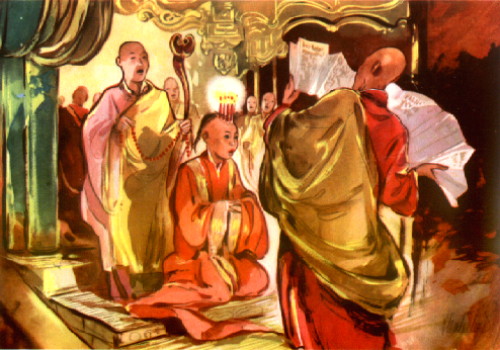 Hier ist auch Marco Polo von kaiserlichen Dienern herumgerudert worden, nach Tempeln und Pagoden, Inseln und Pavillons, Gärten und Brücken, Lotoslagunen und Goldfischteichen. Von den drei Pagoden in der Mitte des Sees können sie sieben Pagoden auf Uferbergen sehen. Sie haben keine Zeit, die 72 Sehenswürdigkeiten anzusehen, die Marco Polo gepriesen hat. Nur den Bergtempel "Kühler Strom" besuchen sie noch. Hier photographieren sie sich gegenseitig vor dem Felsenbild des lächelnden Buddha. Bevor sie den Hangtschau-Schanghai=Expreßzug besteigen, der sie zu ihren Vätern bringen wird, schicken sie noch ein Telegramm: |